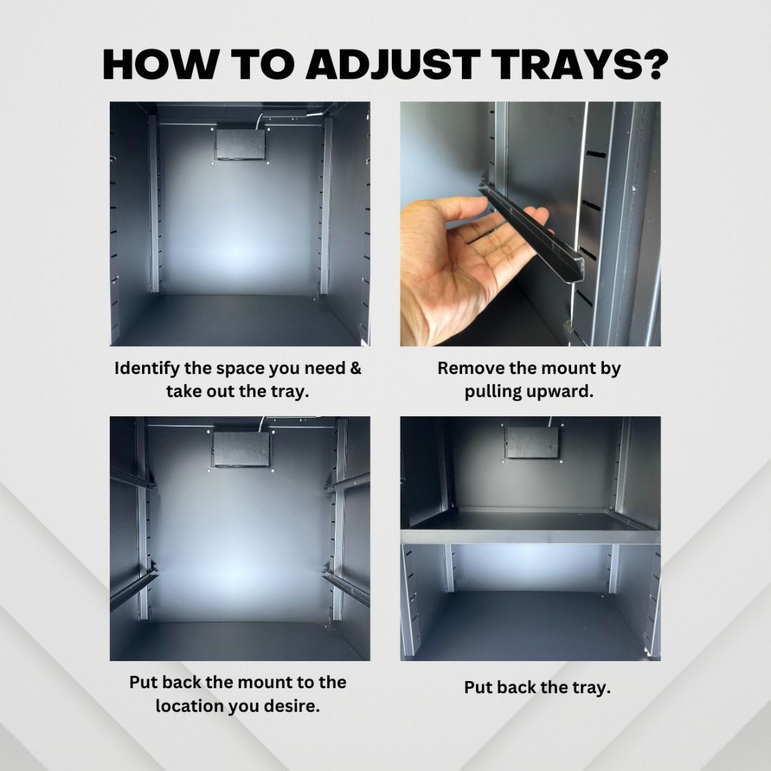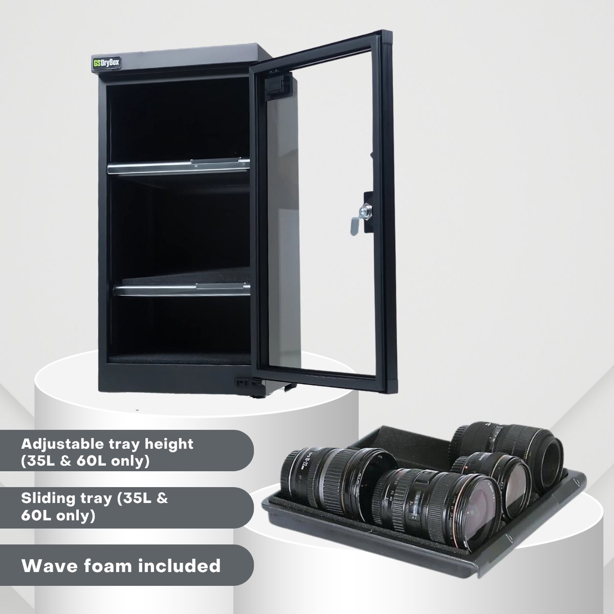 - Adjustable Tray Height Options: The GS DryBox 35L/60L allows you to customize the interior to fit your specific items with adjustable tray height options. This feature adds to the versatility of the dry cabinet.