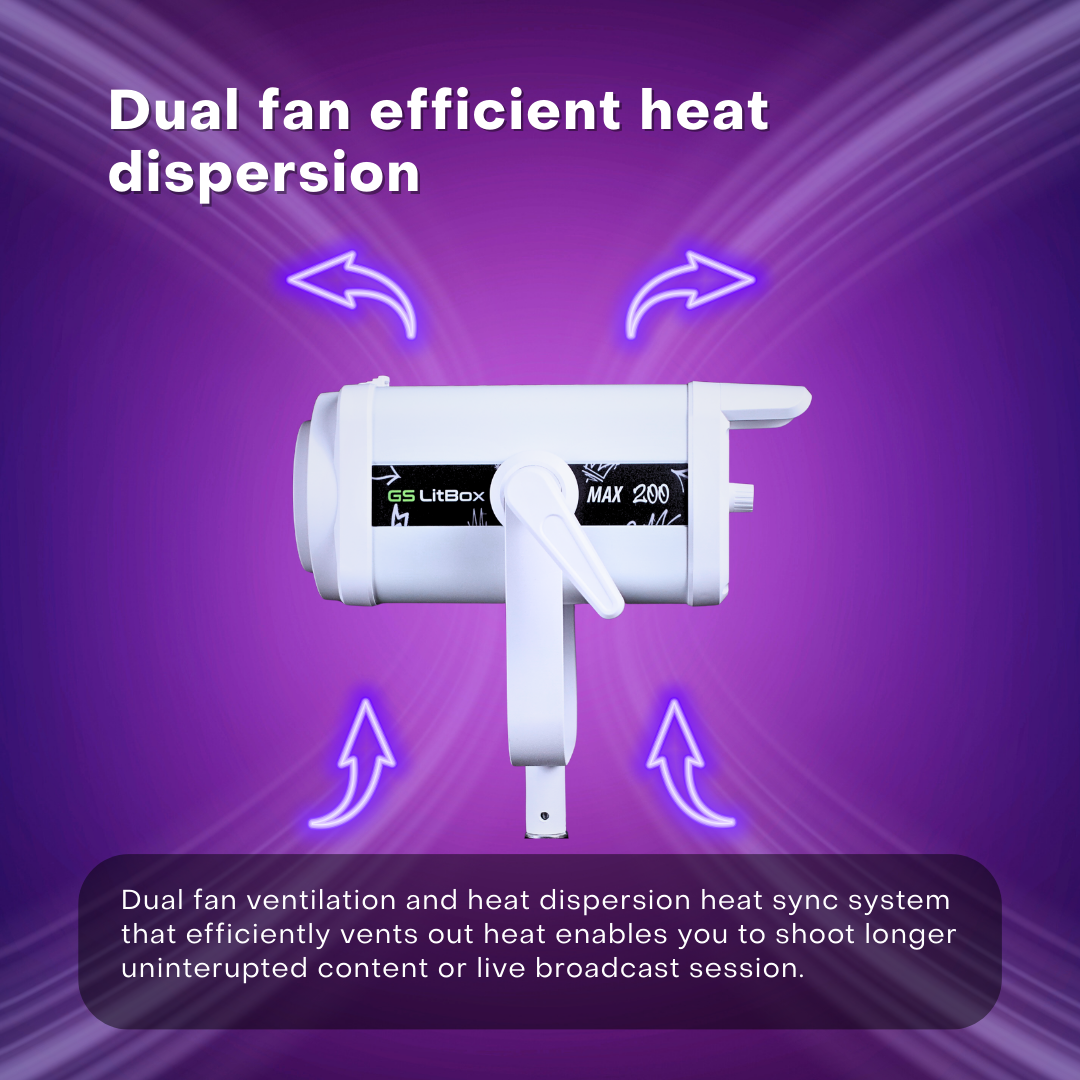 Designed for heavy-duty use, the MAX 200 features a dual fan cooling system to maintain stable performance during extended live sessions and content creation. Whether you’re shooting all day or streaming for hours, this light is made to keep up.