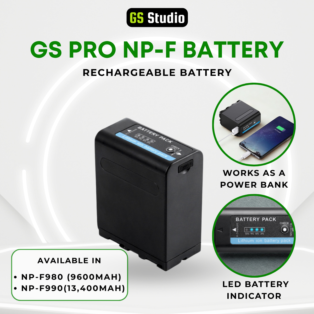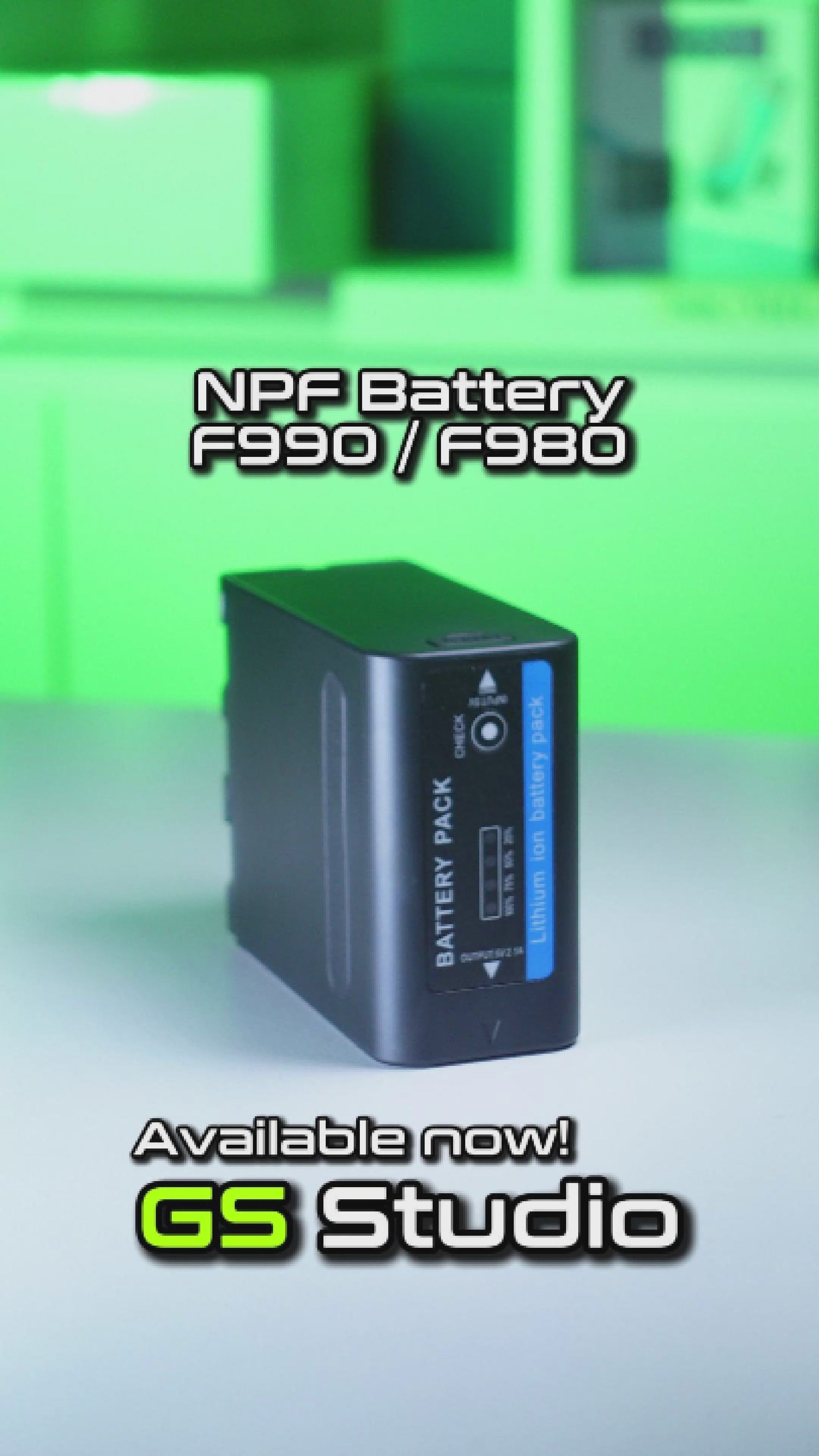 The GS Pro NP-F980A, NP-F980 and NP-F990 series batteries can be used to power video light LEDs, monitors as well as any photo/ video production equipment that is using NP-F series of battery.
