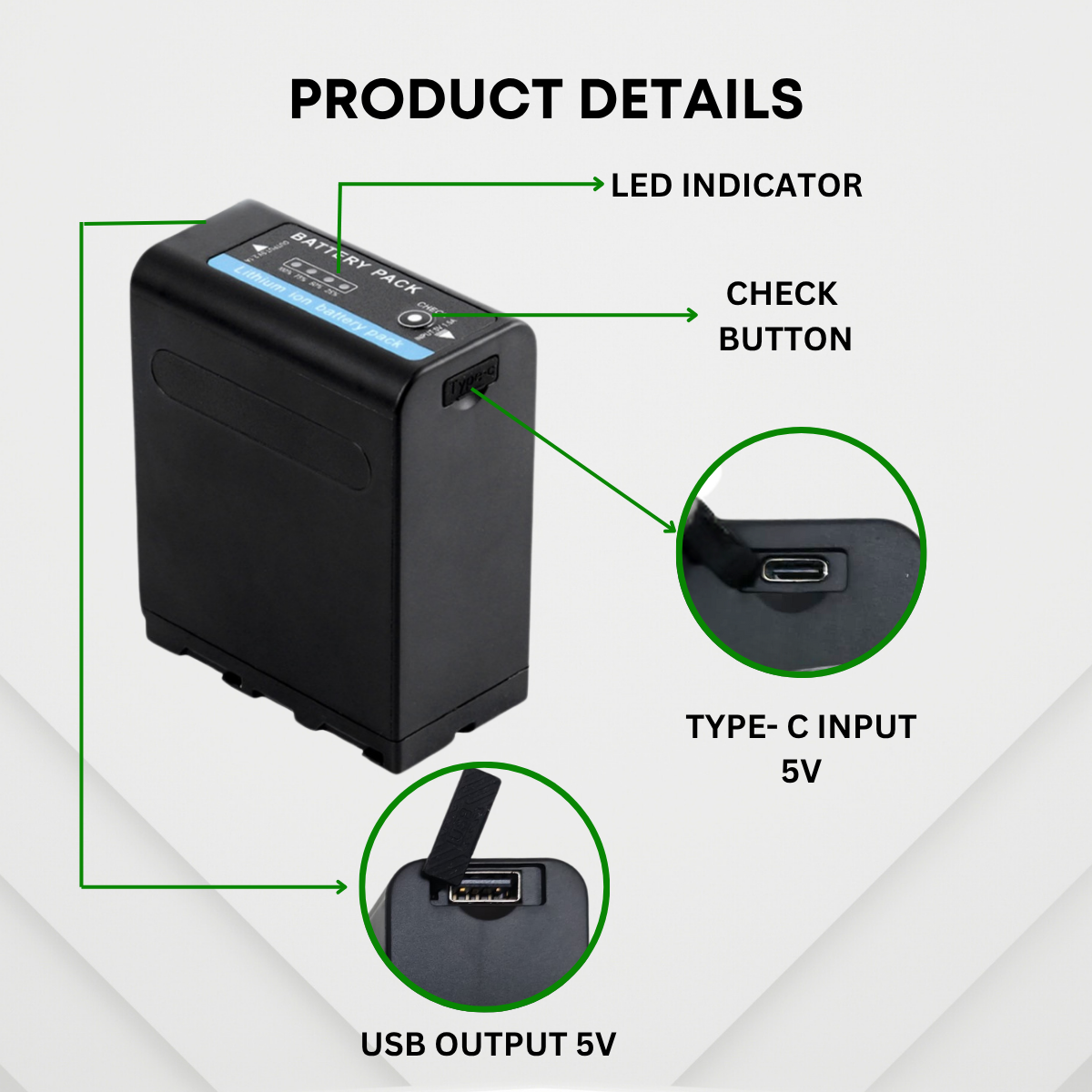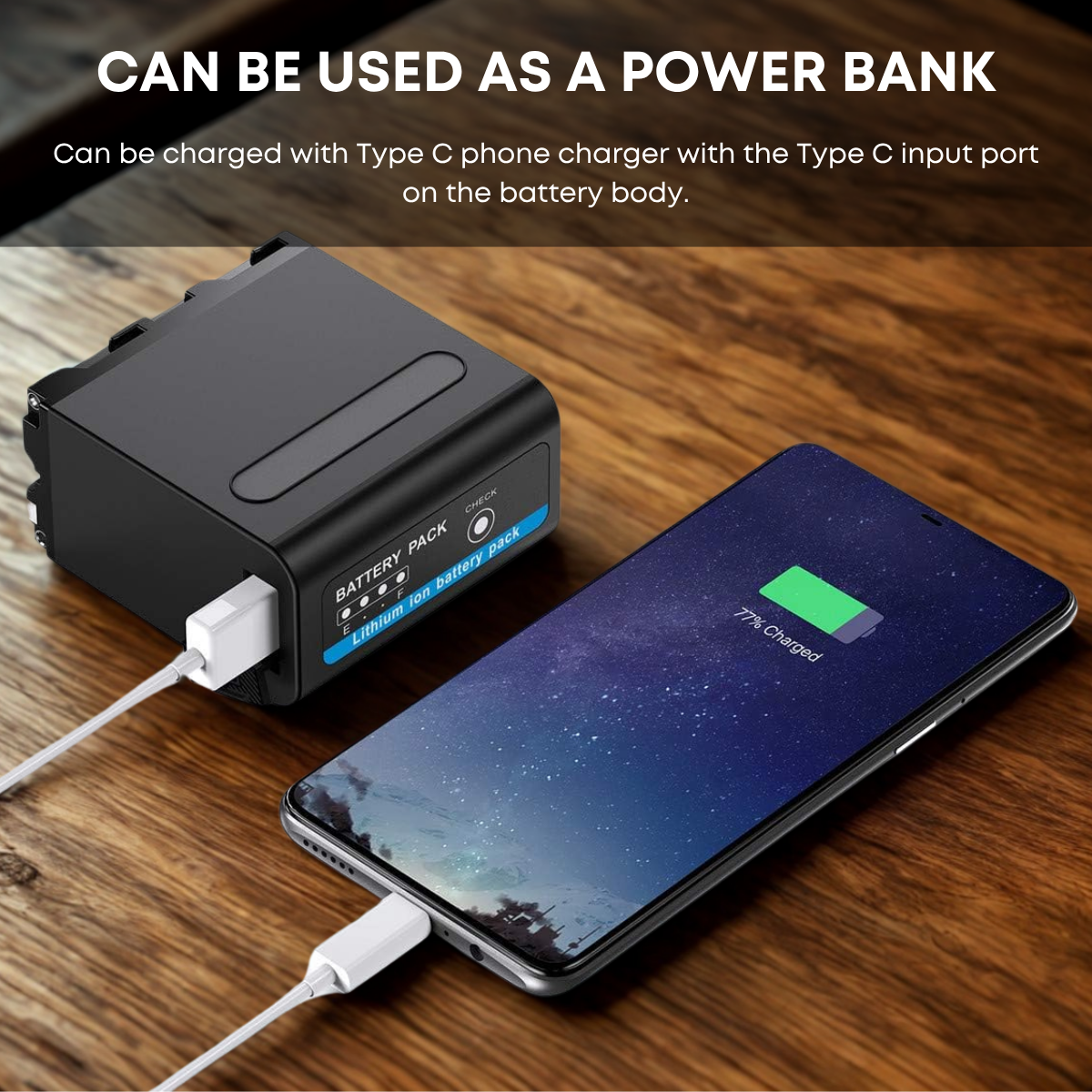 - Can be charged with Type C phone charger with the Type C input port on the battery body.