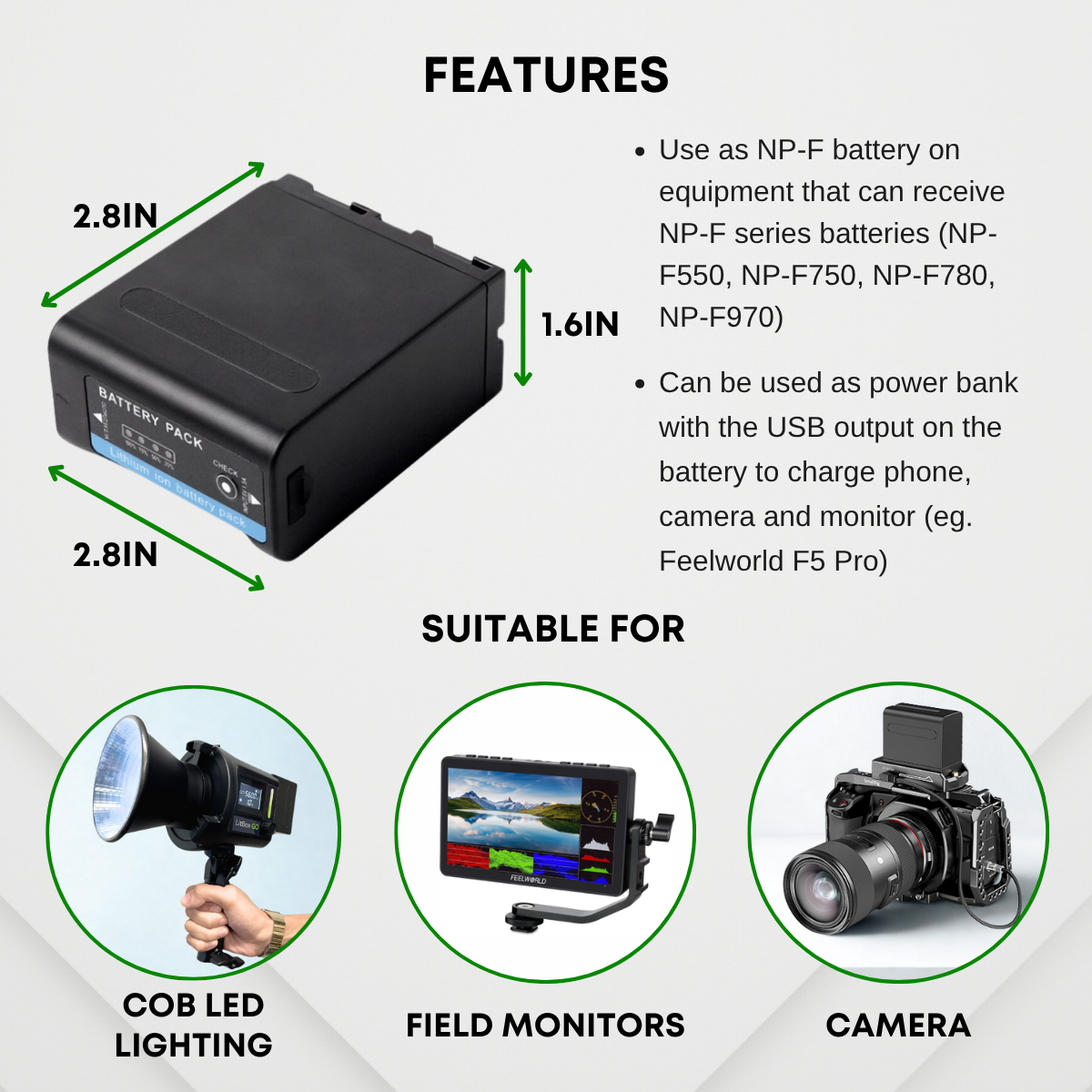 - Can be used as power bank with the USB output on the battery to charge phone, camera and monitor (Feelworld F5 Pro)